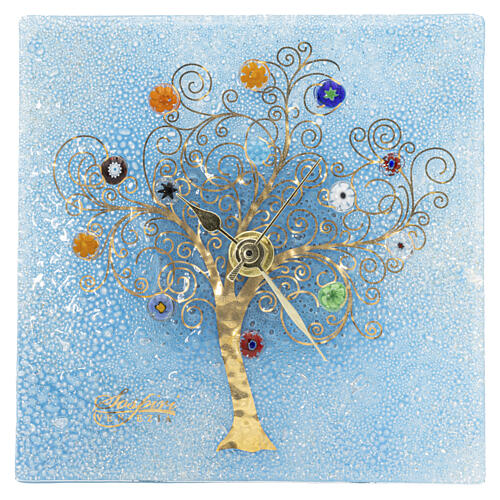 Orologio da tavolo quadrato, soggetto Albero della Vita in oro zecchino e murrine in vetro di Murano, colore azzurro, formato 20x20cm.