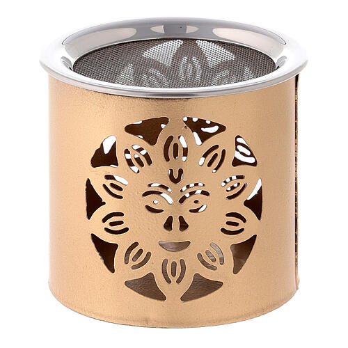 Questo bruciaincenso misura 6x6 cm, ha la forma di un cilindro ed è realizzato in ferro dorato con una traforatura col decoro di un sole presente su entrambi i lati.