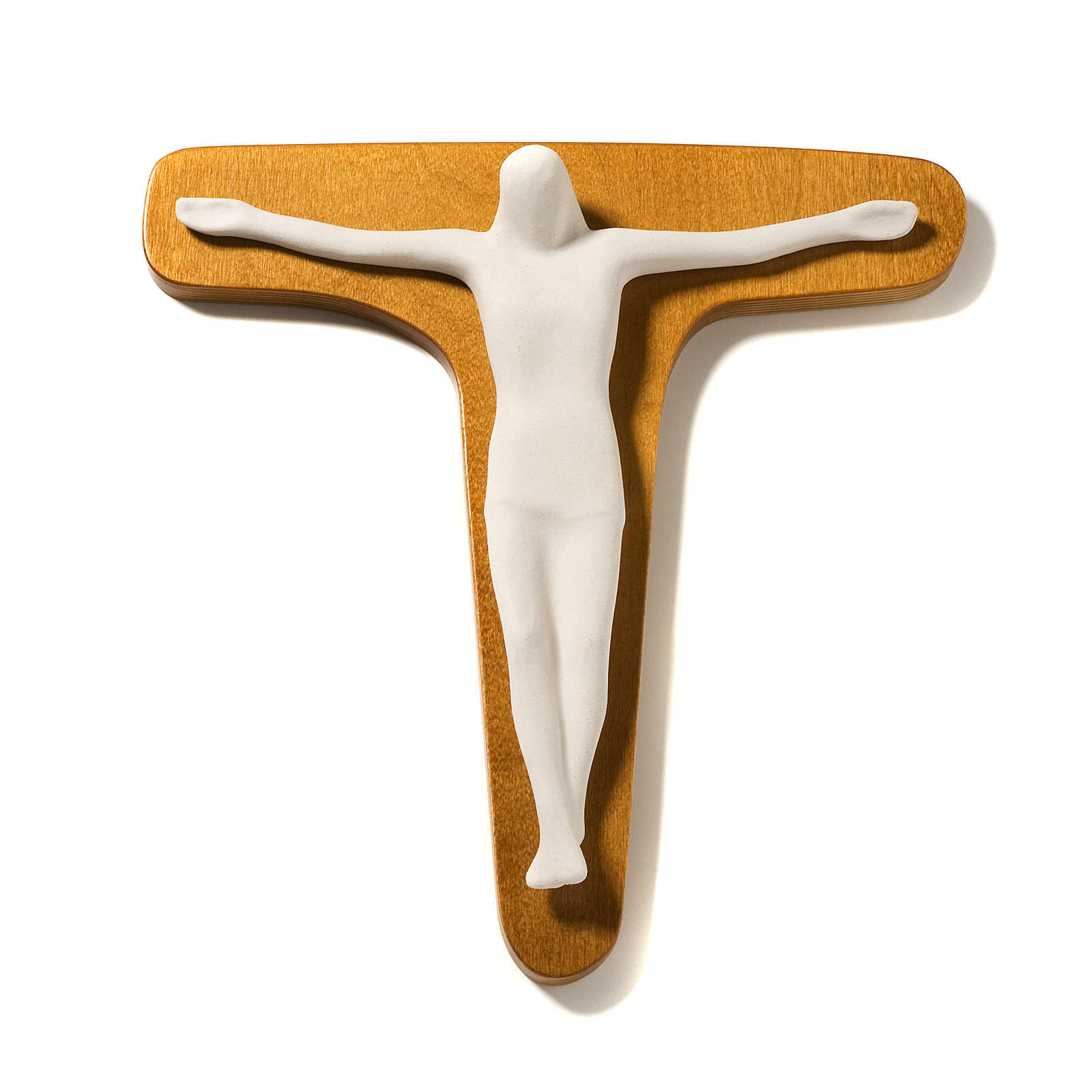 Crocifisso stilizzato con corpo in argilla refrattaria bianca, appoggiato su croce di legno, il tutto realizzato a mano.