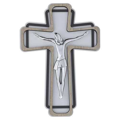 Crocifisso da parete con Cristo stilizzato in metallo finitura argento su base in legno, dimensioni 35x25 cm.