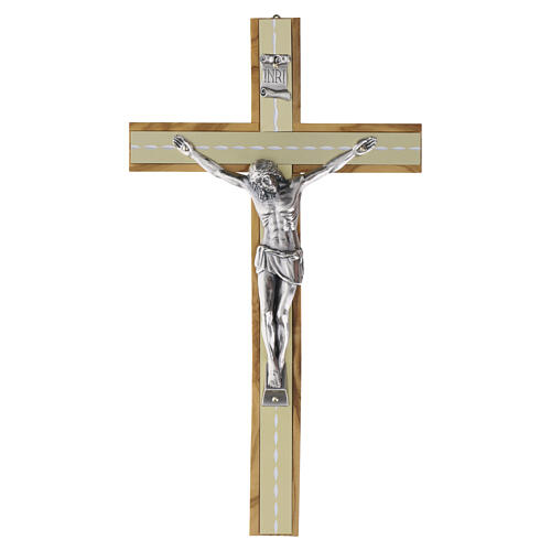 Croce in legno d’ulivo con decorazione centrale in finitura oro, arricchita dalla figura del Cristo in zama argentata applicata in rilievo.