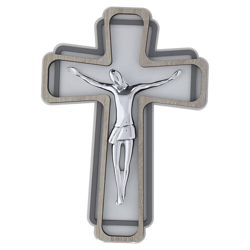 Crocifisso da parete con Cristo in metallo finitura argento su struttura in legno, dimensioni 23x16,5 cm.