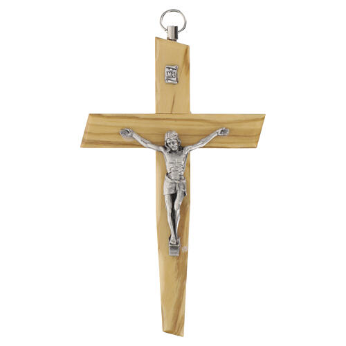 Crocifisso legno ulivo corpo metallo argentato 13 cm