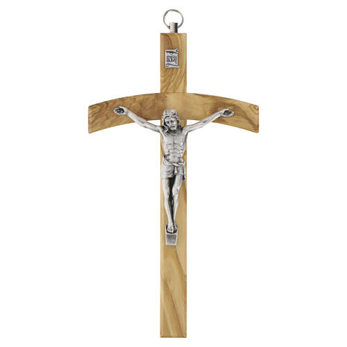 Crocifisso compatto con croce in ulivo e braccio orizzontale arcuato, corpo in metallo argentato, altezza 17 cm.