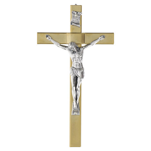 Croce in metallo da parete con struttura in ferro a finitura dorata e corpo centrale in zama effetto argento.