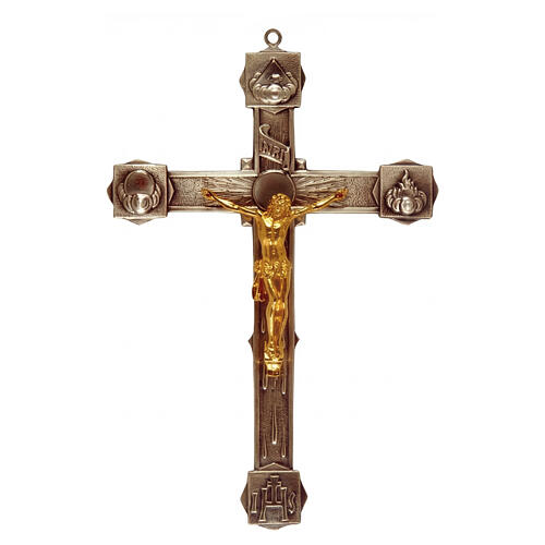 La croce presenta bracci sagomati con formelle in rilievo raffiguranti i simboli trinitari, cartiglio INRI nella parte superiore e raggiera incisa sviluppata dal centro verso le estremità.