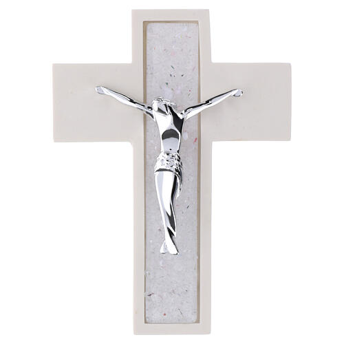 Croce decorativa da parete in resina bianca effetto legno con inserto verticale in vetro di Murano e figura di Cristo in metallo argentato dimensioni 13,5x10 cm.