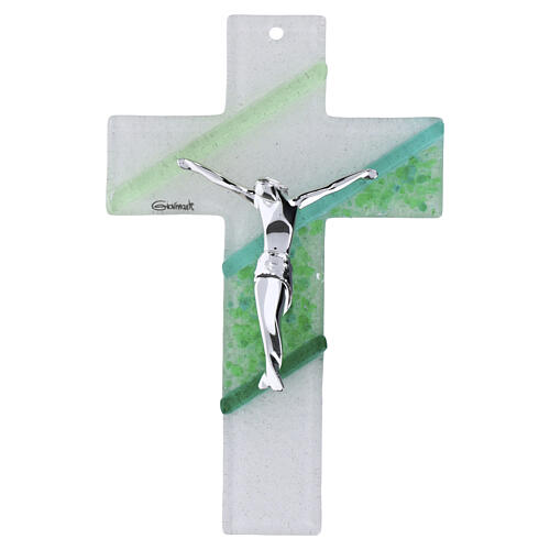 Croce in vetro di Murano satinato con inserti verdi e Cristo argentato 16x10,5 cm.