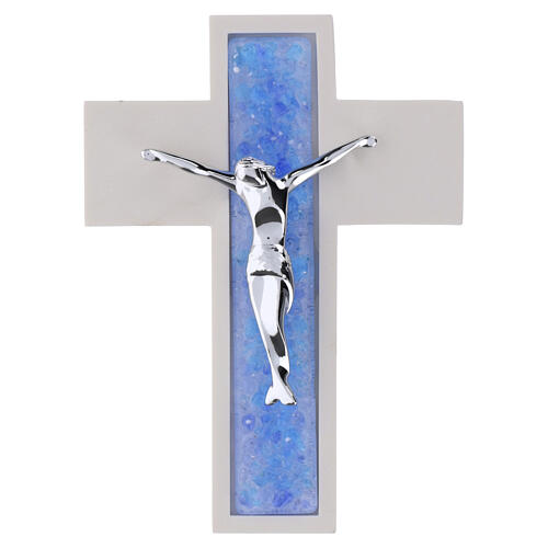 Croce in resina effetto legno bianco con fascia centrale in vetro di Murano blu e figura di Cristo in metallo argentato dimensioni 13,5x10 cm.
