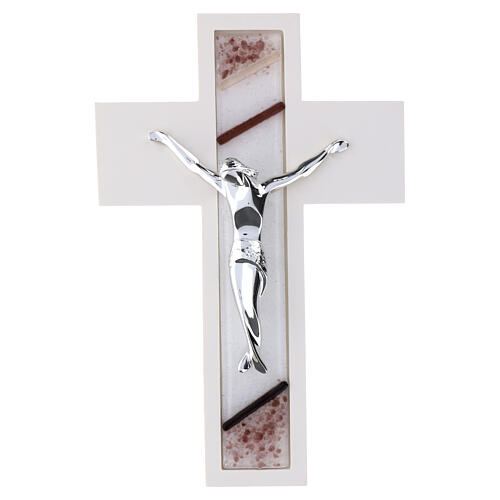 Croce decorativa da parete in resina effetto legno bianco con inserto centrale in vetro di Murano rosa scuro e figura di Cristo in metallo argentato dimensioni 25x15 cm.