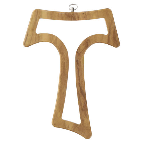 Croce Tau con parte interna aperta, ottenuta da legno di ulivo tornito, altezza 15 cm.