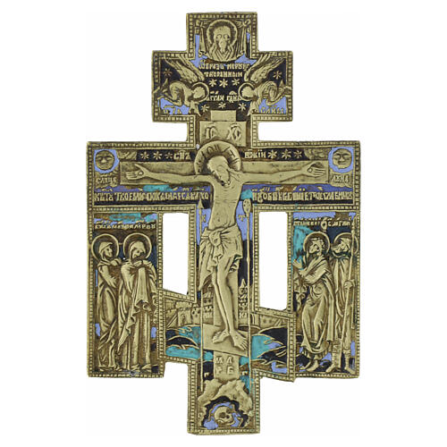 Tipico crocifisso ortodosso russo in bronzo con smalti, caratterizzato dalla tradizionale struttura a tre traverse, con quella inferiore fortemente inclinata, simbolo della “bilancia della giustizia”: da un lato il buon ladrone che sale al Paradiso, dall’altro il cattivo ladrone che si allontana dalla salvezza.