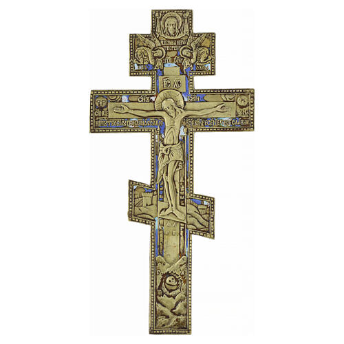 Crocifisso ortodosso russo in bronzo con smalti, databile all’inizio del XIX secolo, esempio significativo della tradizione iconografica dell’Europa orientale. La struttura è quella tipica della croce russa a tre traverse, con quella inferiore inclinata, simbolo della “bilancia della giustizia”: da un lato il buon ladrone accolto in Paradiso, dall’altro il cattivo ladrone che si allontana dalla salvezza.