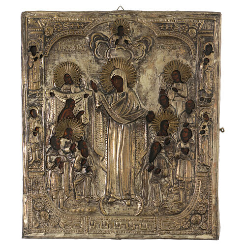 Icona ''Gioia di tutti gli afflitti'' russa antica 35x30 con riza metallo.