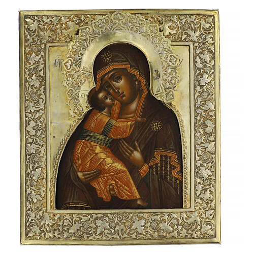 Icona russa antica Madre di Dio di Vladimir riza argento XIX sec 33x27 cm