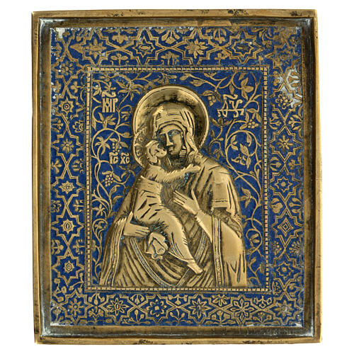 Icona viaggio Madonna Vladimir Mosca bronzo XIX sec 15x15 cm