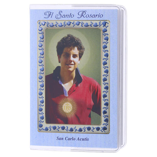 Minilibretto pieghevole con copertina a colori dedicata a San Carlo Acutis e testi interni del Santo Rosario stampati su carta leggera.