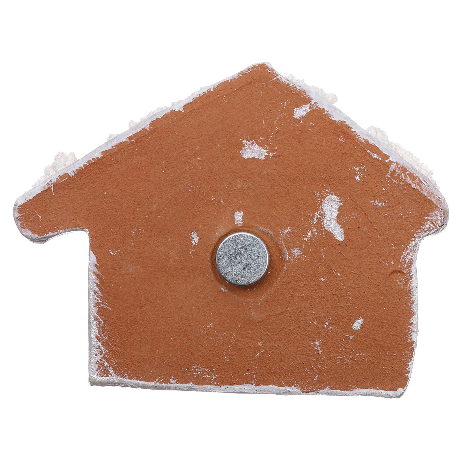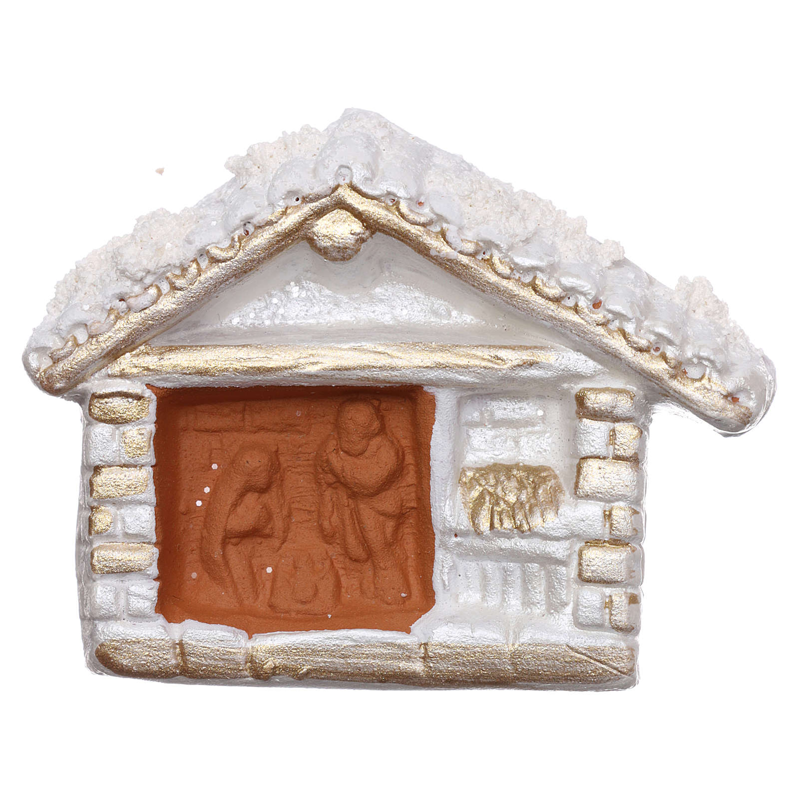 Calamita a forma di capanna bianca con finiture oro e bassorilievo della Natività in terracotta naturale.