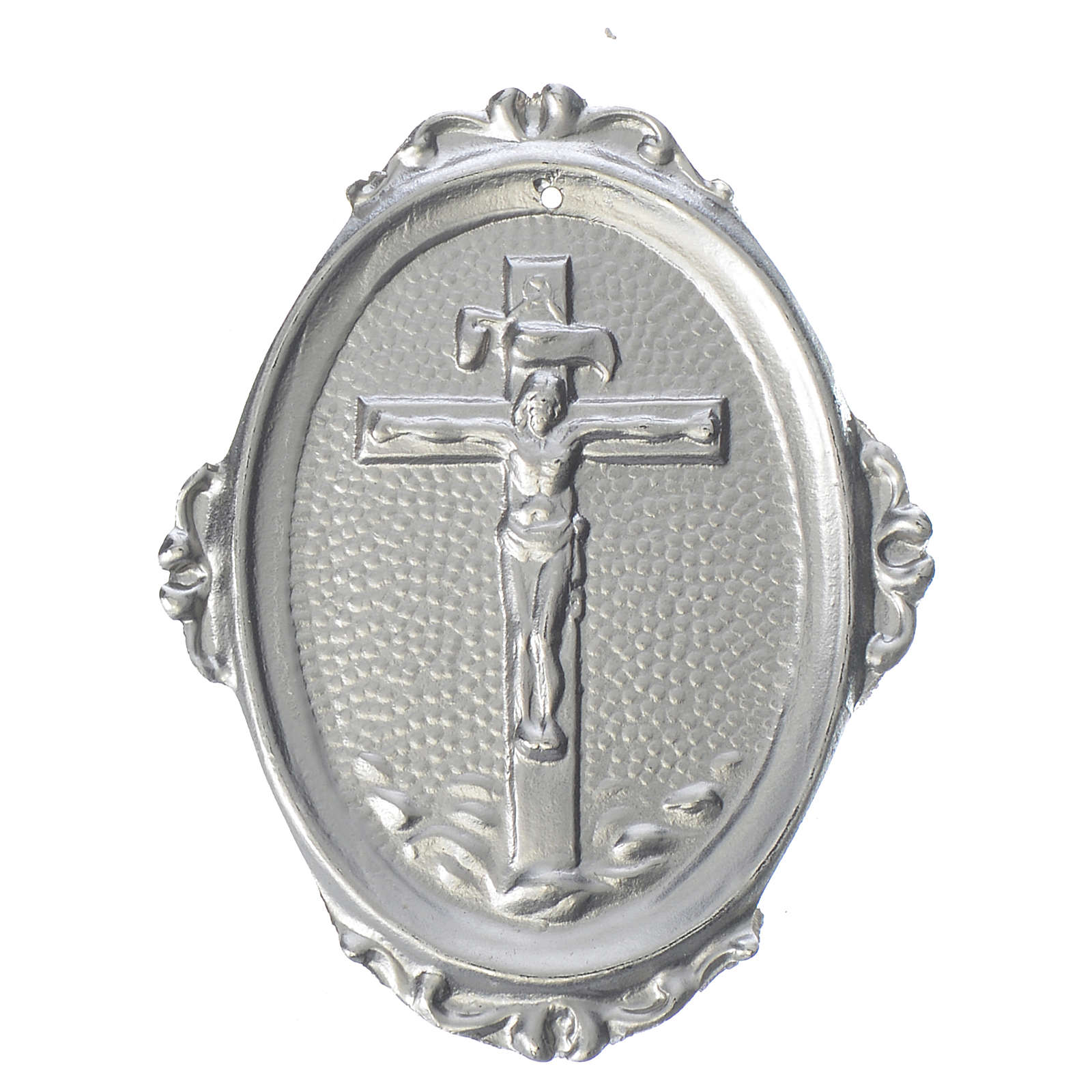 Medaglione per confraternita realizzato in metallo argentato o dorato (a scelta). Tutte le fasi della lavorazione sono eseguite interamente in Italia: dallo stampaggio al taglio, e anche le finiture.