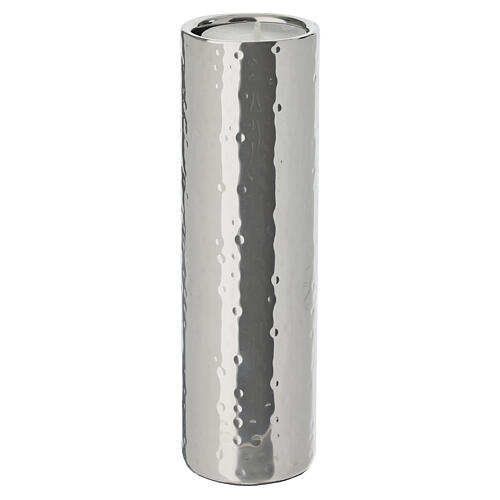 Portacandela cilindrico in metallo con lavorazione martellata e struttura compatta.