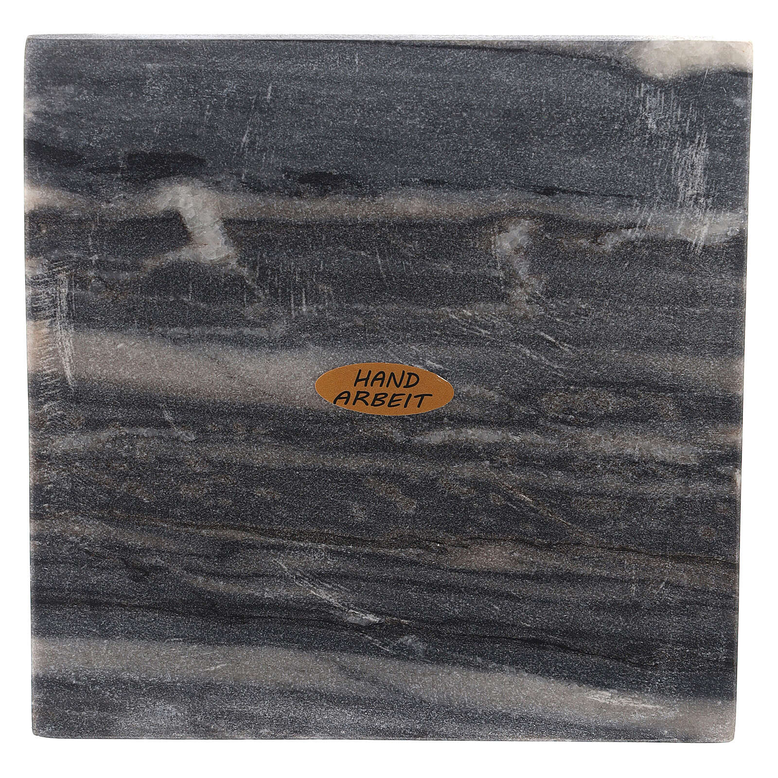 Piatto costituito da una lastra quadrata di pietra naturale di lato 14 cm e adatto per candele fino ai 14 cm di diametro. A causa della varietà di colori e disegni della roccia, ciascun piatto è unico e diverso dagli altri.