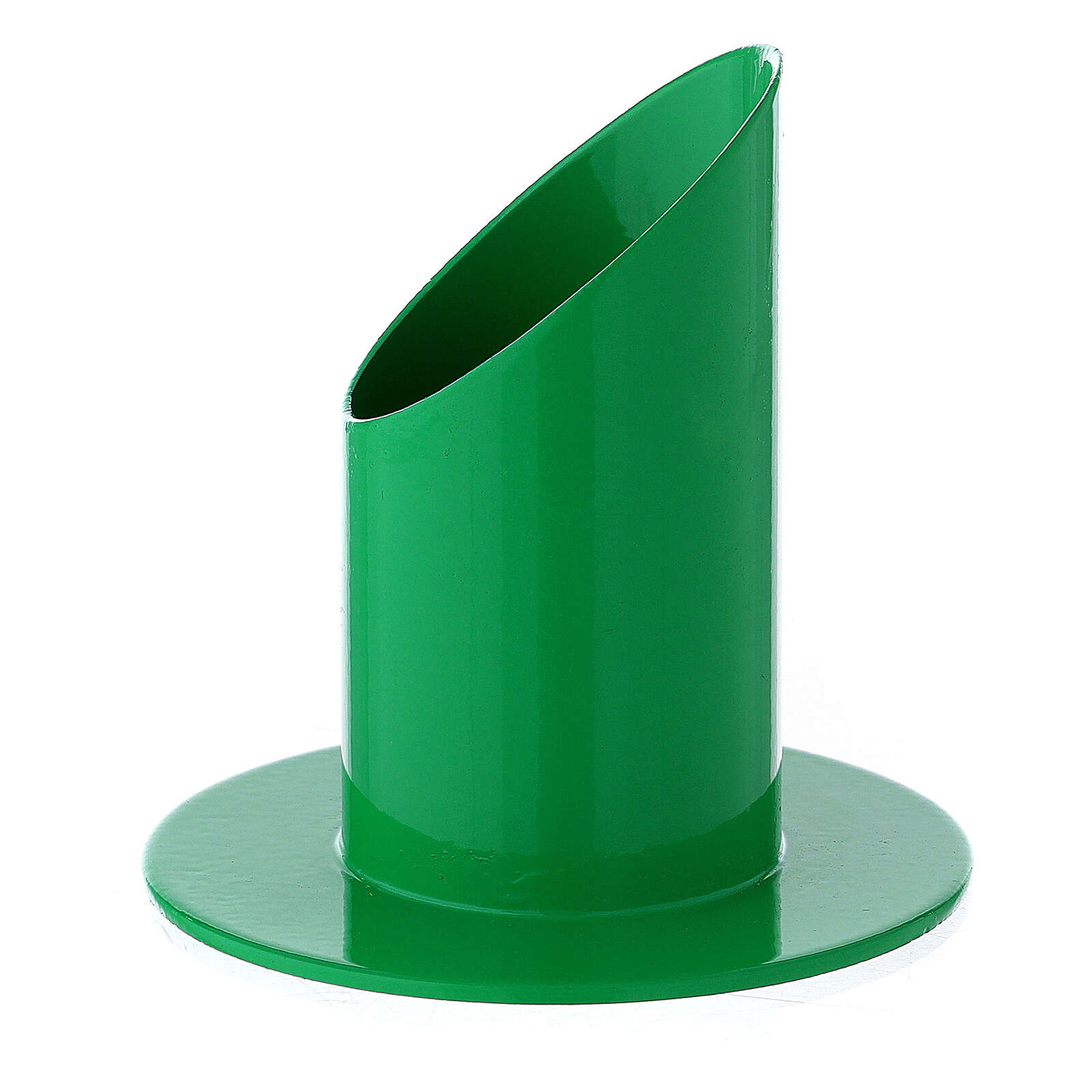 Base per candela color verde intenso, realizzata a mano in ferro. Il bossolo dal taglio obliquo ha diametro 4 cm. Adatto anche per uso domestico.