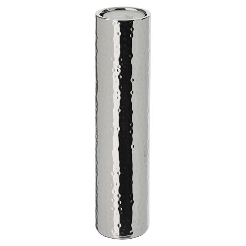 Portalumino cilindrico in metallo con finitura martellata e configurazione verticale.