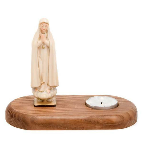 La statuetta è fissata su una base in legno tinto scuro con incavo portacandela. Il lume è compreso nella confezione.