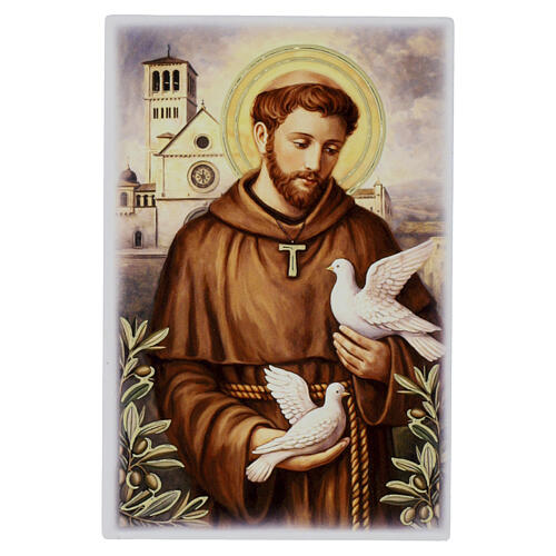 Formato compatto con raffigurazione di San Francesco in tonalità calde e dettagli decorativi su elementi simbolici essenziali.