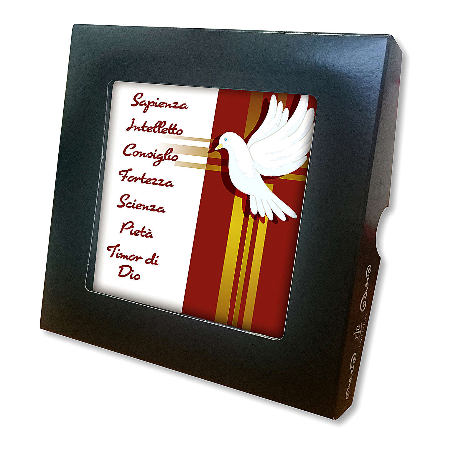 Piastrella in Ceramica di Sassuolo stampata nei laboratori della Fratelli Bonella. La grafica soft utilizzata nel riprodurre i Doni dello Spirito Santo unitamente all'elegante scatola contribuiscono a rendere questo oggetto un perfetto ricordo del Sacramento della Confermazione o una bomboniera dal sicuro effetto.