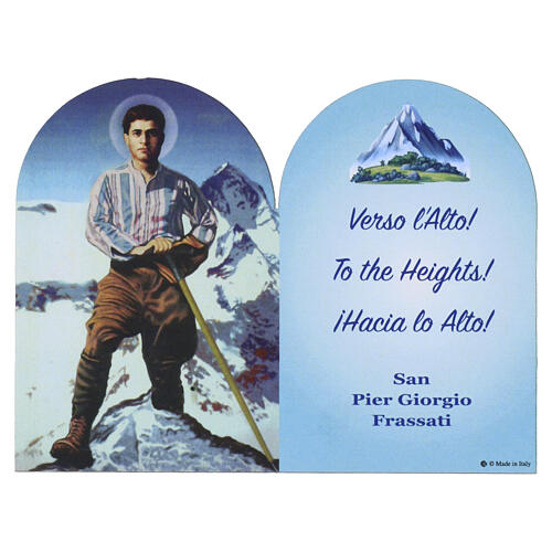 Santino sagomato in cartoncino con immagine a colori di San Pier Giorgio Frassati in abbigliamento da escursionismo e sfondo montano.