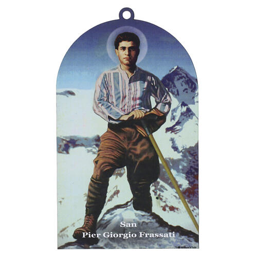 Quadretto in legno con stampa a colori di San Pier Giorgio Frassati su fondo montano e sagomatura a cupola con foro centrale per appensione.
