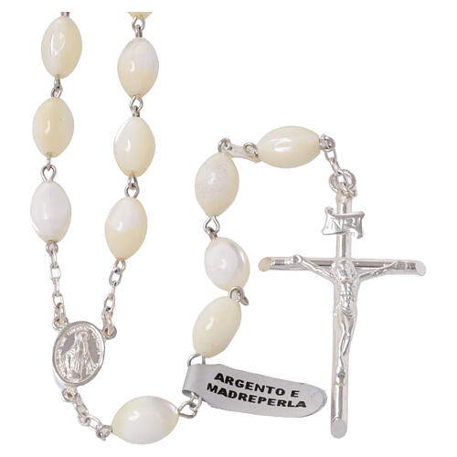 Rosario in argento 925 con grani ovali 12x9 cm in madreperla bianca. La crociera raffigura il profilo della Madonna ed è in argento 925, lo stesso materiale utilizzato anche per il crocifisso 4,5x3 cm con cui culmina il gioiello. La circonferenza misura 102 cm. Si tratta di un prodotto realizzato a mano da abili artigiani italiani, esperti nella lavorazione della filigrana.