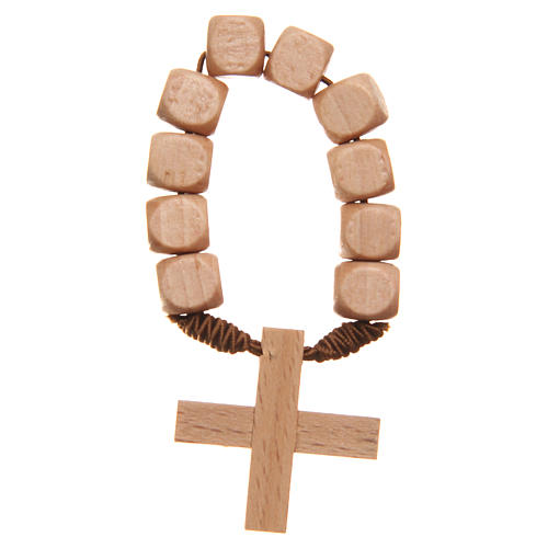 STOCK Rosario basco decina con grani a forma di cubetto in legno, legati in seta grezza.