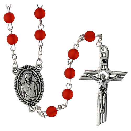 Rosario San Carlo Acutis con grani in materiale plastico satinato rosso vetro e metallo 6 mm.