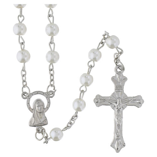 Il rosario è realizzato con grani in vetro finitura perlata colore bianco collegati da catena con croce metallica coordinata.