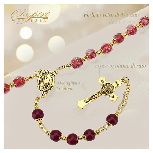 Rosario con grani da 8mm in vetro di Murano rosso dagli accenti dorati. Il rosario è completato da una croce dorata di San Benedetto e da una crociera in ottone raffigurante la Madonna di Fatima.