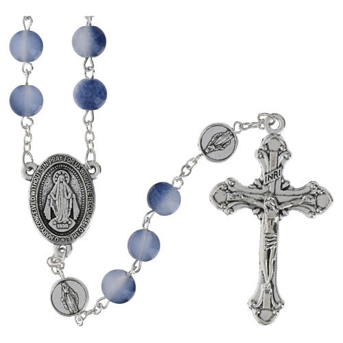 Rosario mariano con grani in vetro blu scuro a doppia tonalità e pater Madonna Miracolosa vetro e metallo 8 mm.