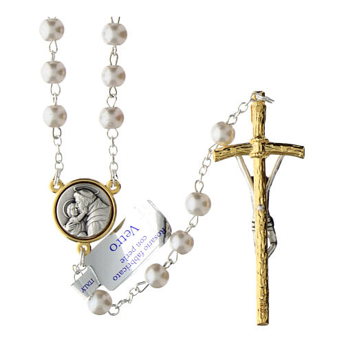 Rosario realizzato con perle in vetro e medaglione con raffigurati i Santi Francesco e Antonio. Ogni fine decina vi sono delle medaglione con raffigurati i volti dei santi e il bordo in oro lucido, le dimensioni sono di 1,5 cm mentre la grandezza delle perle è di 5 mm.