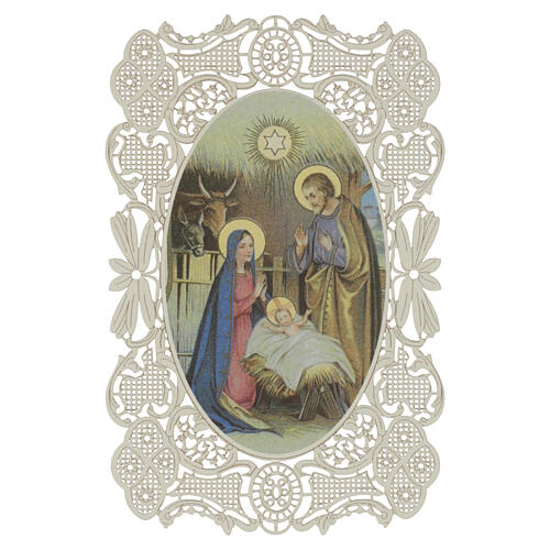 Santino Natività classica con capanna e stella 12x7 cm decoro merlettato
