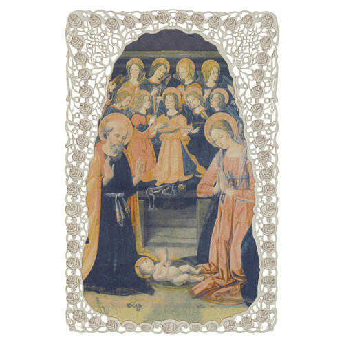 Il santino rappresenta la scena della Natività con San Giuseppe e Maria in adorazione, accompagnati da un gruppo di angeli sullo sfondo.