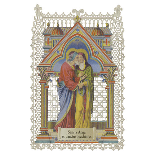 Il santino rappresenta i Santi Anna e Gioacchino, genitori della Vergine Maria, in un abbraccio affettuoso all'interno di una struttura architettonica gotica colorata.
