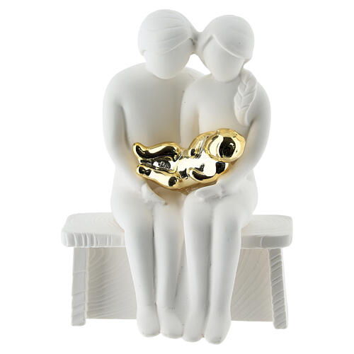 Scultura moderna in resina opaca raffigurante una coppia seduta su panca con neonato tra le braccia, realizzato in finitura dorata a contrasto.