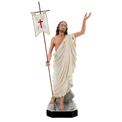 Questa statua raffigura Gesù Risorto, che tiene in mano croce e bandiera. La statua, alta 65 cm, è realizzata in resina e si contraddistingue per la colorazione, eseguita a mano da Arte Barsanti, una bottega italiana con più di un secolo di storia.