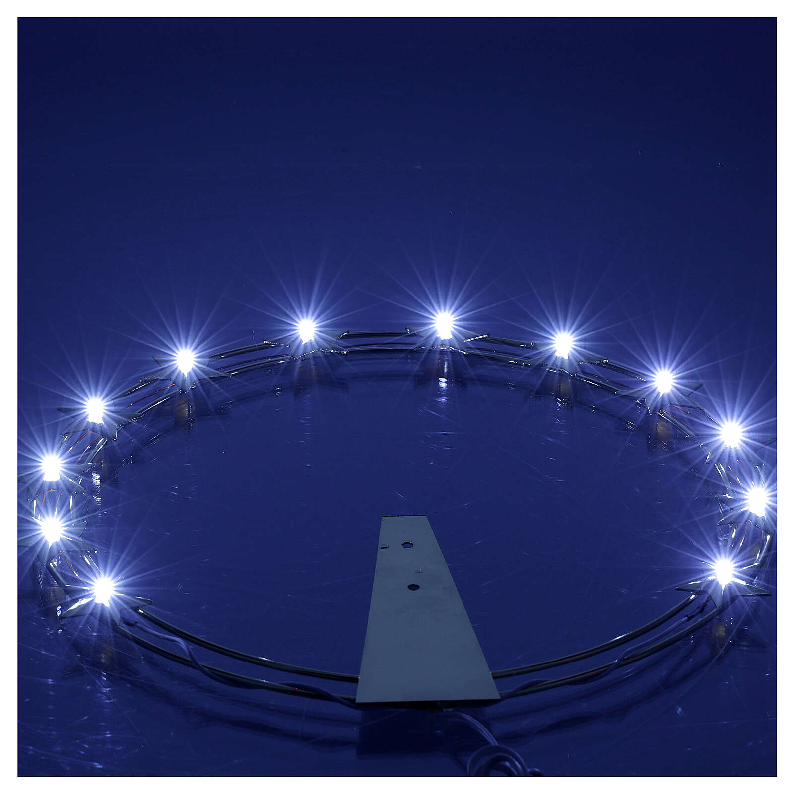 L'aureola ha 12 stelle e su ognuna è stata inserita un led e viene consegnata con trasformatore 220V/3.5V.