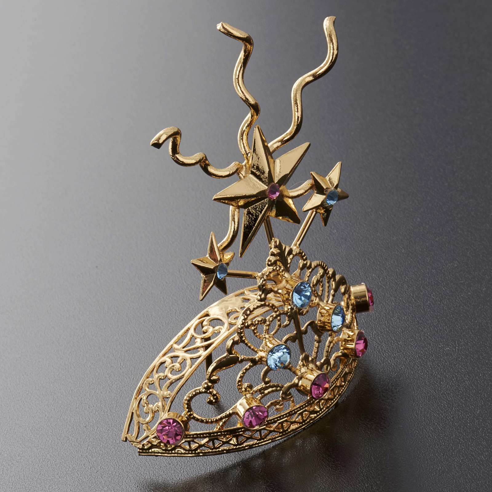 Diadema per statue in ottone con filigrana dorata e strass colorati.