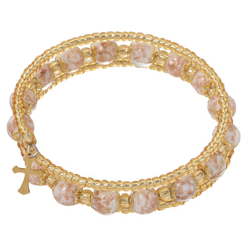 Bracciale composto da perle da 8mm in vetro di Murano bianco, montate su struttura elastica con finitura oro, chiusura a molla e croce dorata inclusa nel design.