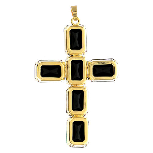 Croce pendente con castoni in ottone dalla finitura galvanica nichel free dorata, decorata da sei cristalli di colore nero con variegature verdi. La croce, dotata di gancetto per essere appesa, misura 8,5x4,8 cm.