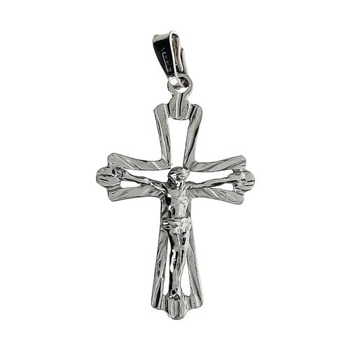 Pendente raffigurante una croce trilobata sagomata con Cristo in rilievo in argento 925 rodiato. La croce misura 3x2 cm e pesa 2 gr circa. Il pendente è interamente realizzato a mano da abili artigiani italiani esperti nella lavorazione dell'argento.
