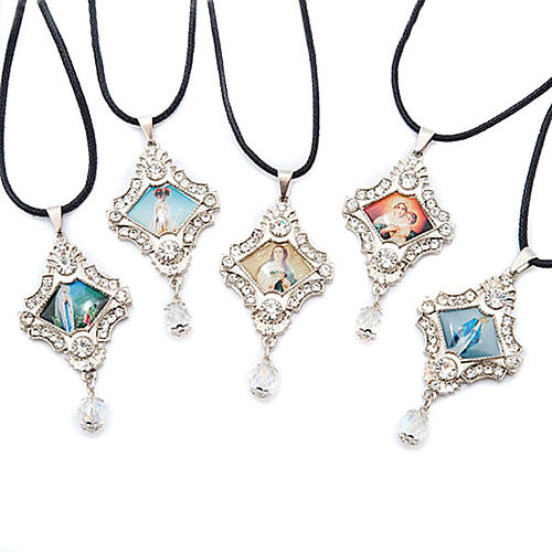 Luminoso ciondolo in metallo color argento con immagini varie di Maria Vergine.